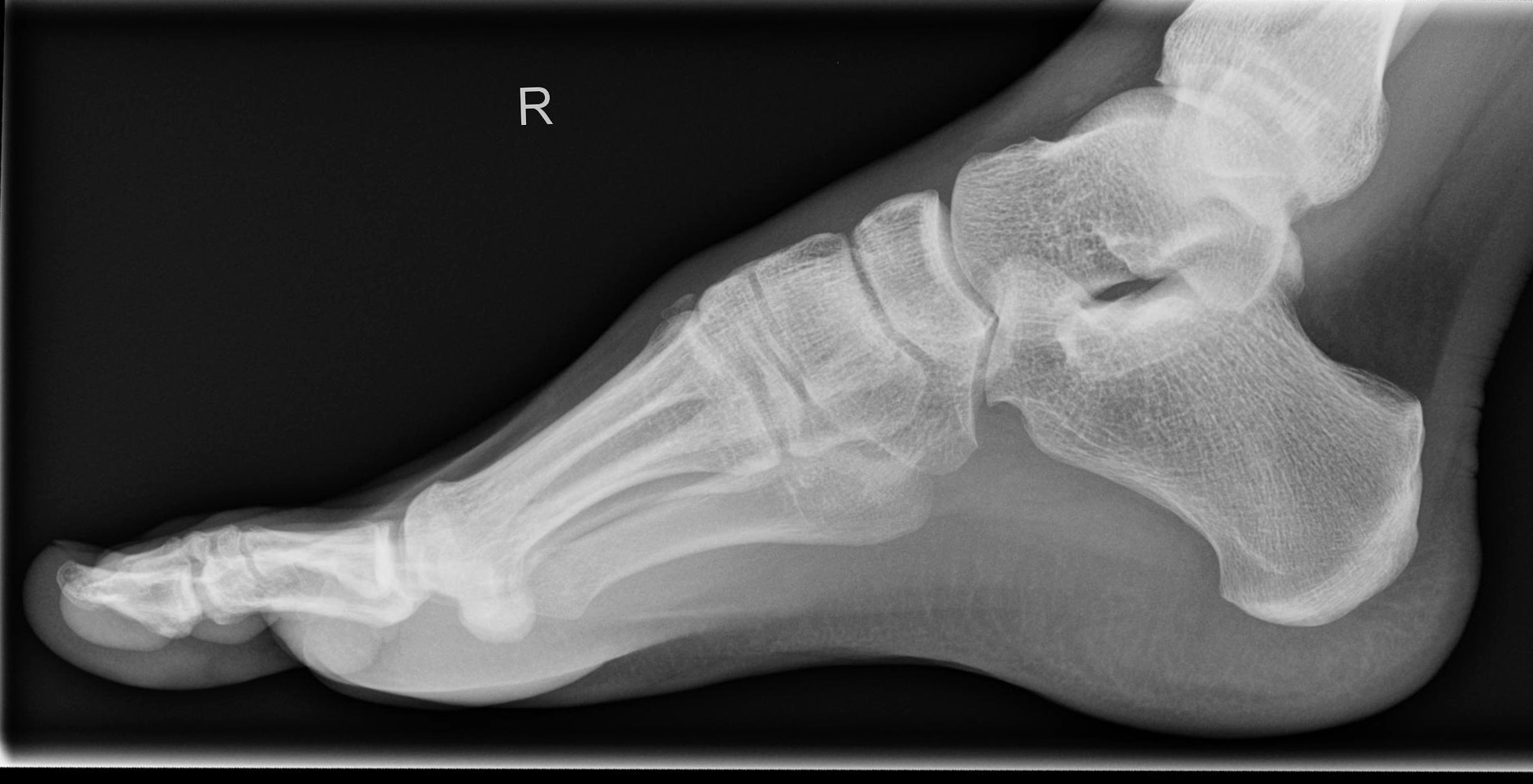 Seitliche Aufnahme des ganzen Fußes. Die Mittelfußknochen und Phalangen überlagern sich. Oberes und unteres Sprunggelenk sind gut einsehbar. Überlagerungsfreie Darstellung des Fersenbeins.