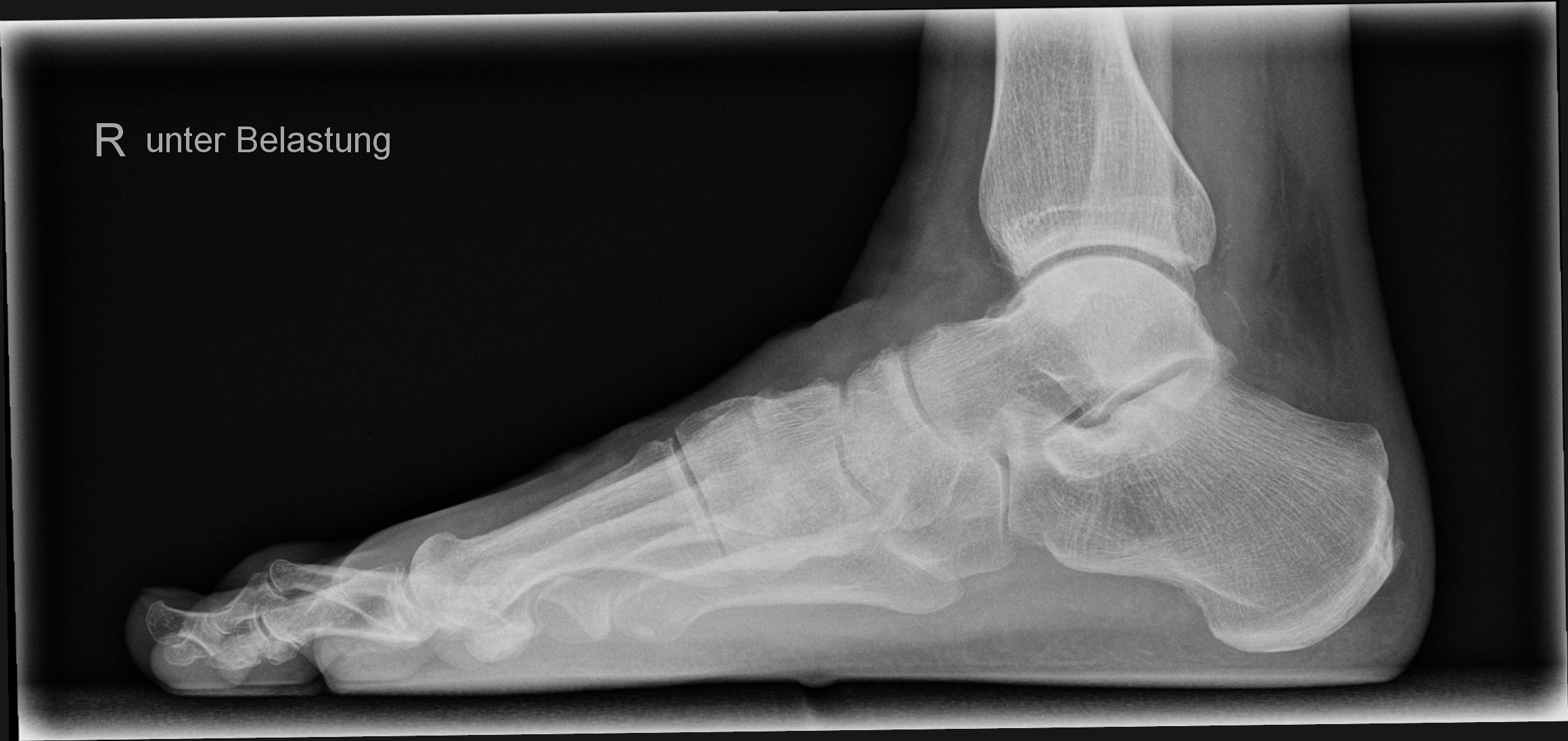 Seitliche Aufnahme des ganzen Fußes. Die Mittelfußknochen und Phalangen überlagern sich. Oberes und unteres Sprunggelenk sind gut einsehbar. Überlagerungsfreie Darstellung des Fersenbeins.