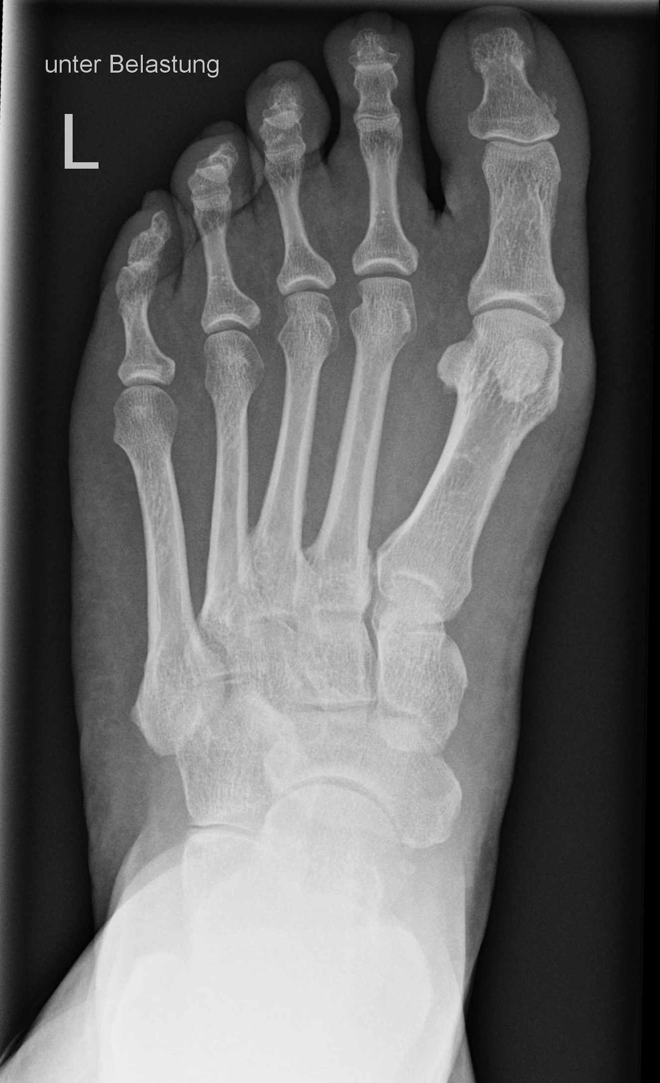 Metatarsalien decken sich an ihrer Basis, bei Verdacht auf Senkfuß eine Aufnahme im Stehen mit Belastung, d.h. gesundes Bein anheben, mit angestelltem Bildempfänger und horizontalem Strahlengang.