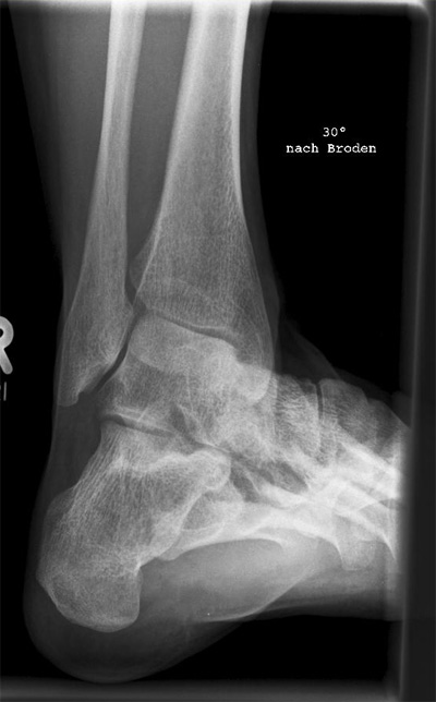 Wenn Ferse aufliegt, haben wir eine streng seitliche Projektion des Fußgelenkes, wenn der Vorfuß aufliegt, werden die 3 Gelenke des Sprungbeines dargestellt.