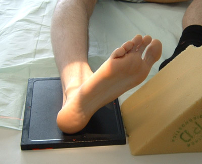 Patient in Rückenlage auf dem Tisch; Bein ausgestreckt und 45° nach außen (lateral) gegen ein 45° Keil drehen lassen. Fuß anziehen.