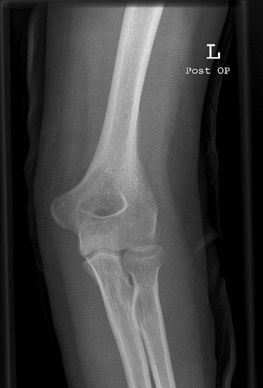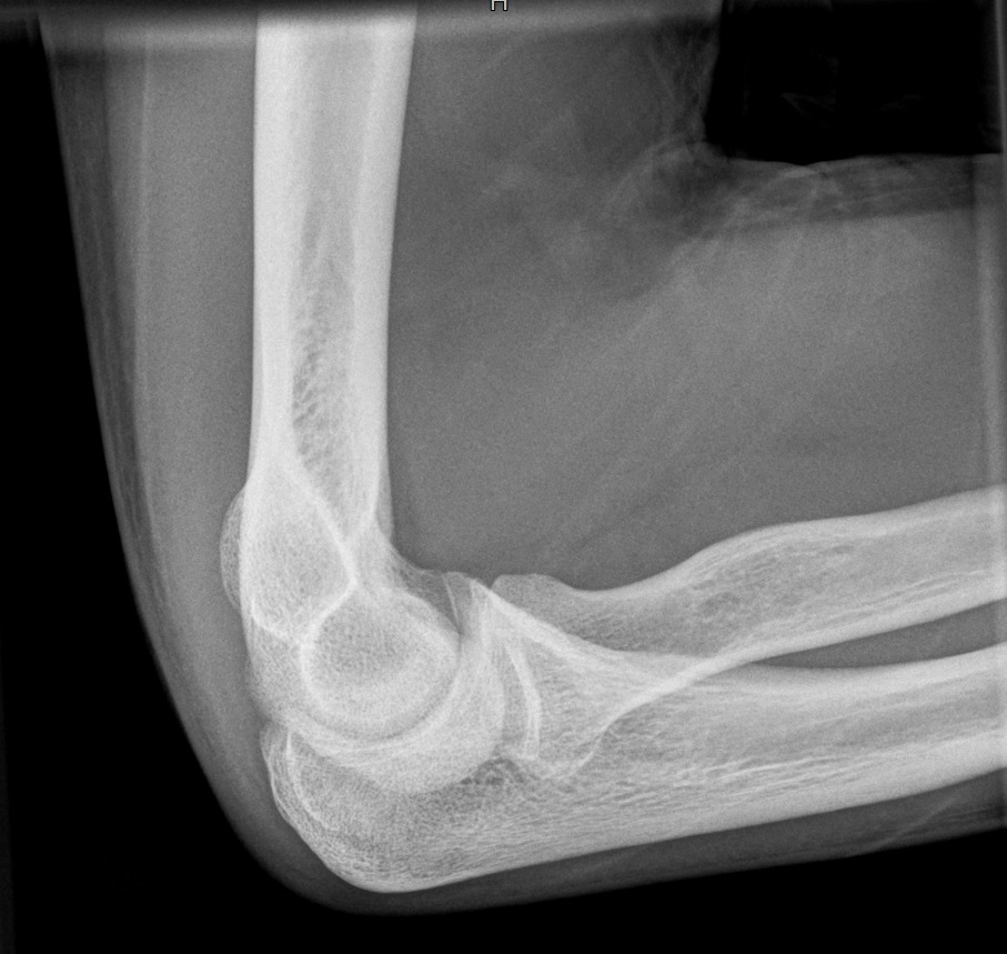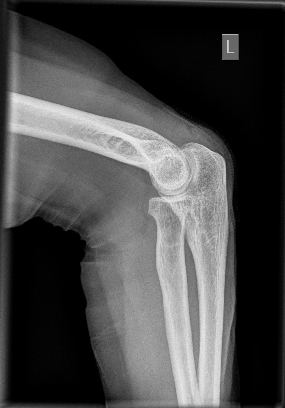 Der Gelenkspalt zwischen Humerus und Radiusköpfchen ist nicht frei; die Gelenkfläche des Radiusköpfchen ist stark oval gezeichnet und verdeckt die Gelenkfläche des Humerus. Der Patient kippte den Vorderarm mit der Hand hoch statt sie flach aufzulegen.