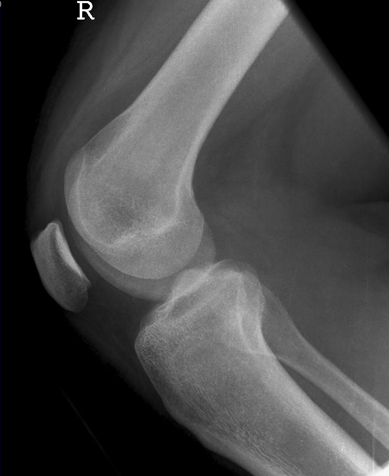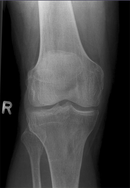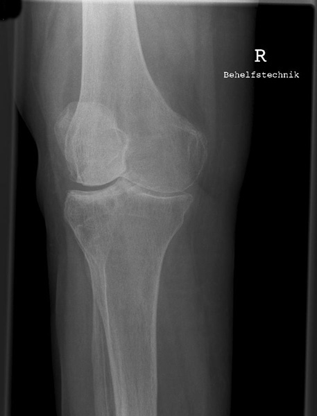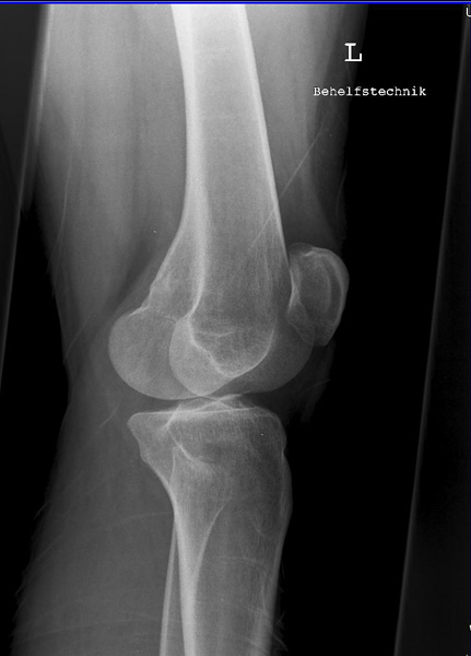 Die filmferne Femurrolle "rutscht" mit ihrer Konturlinie nach unten und überdeckt die ganze Eminetia intercondylaris. Das Knie ist seitlich getroffen, jedoch war der Unterschenkel nicht auf einer Höhe mit dem Oberschenkel.