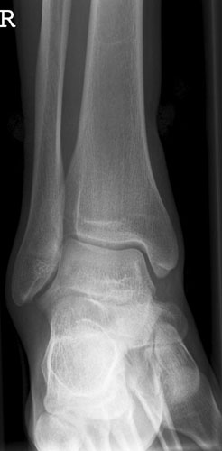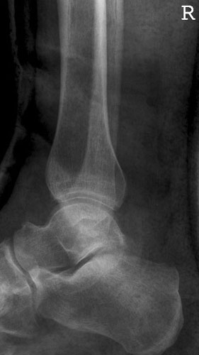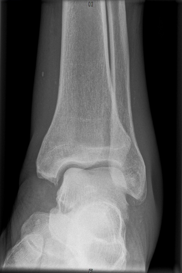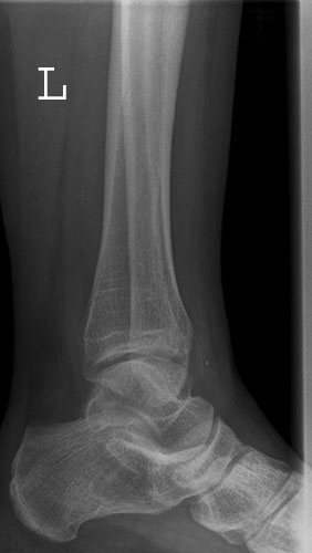 Doppelkonturierung im vorderen Teil der Talusrolle. Die Fibula ist gegen dem Malleolus internus nach ventral verschoben. Die Längsachse des Talus ist verkürzt. Das untere Sprunggelenk kann nicht beurteilt werden.