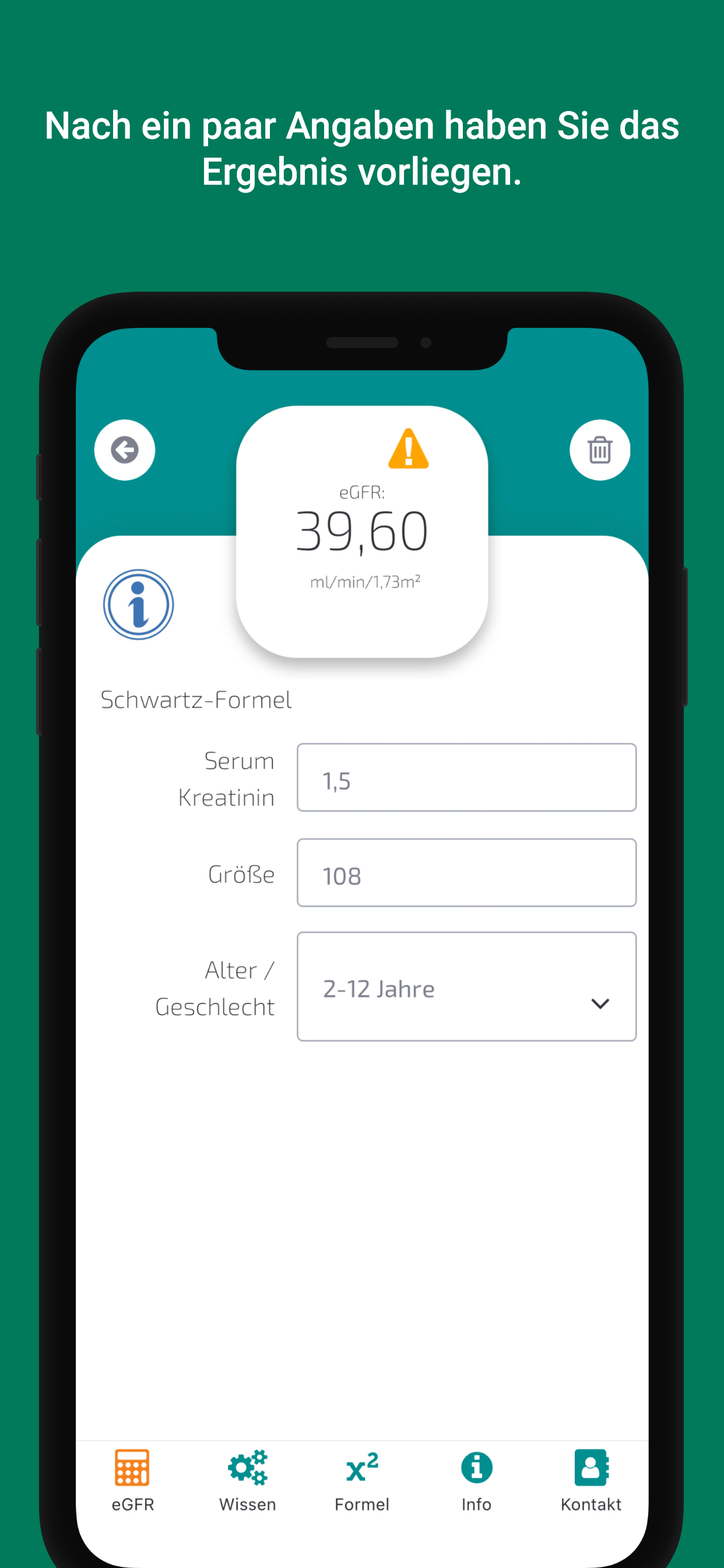 Als wichtiger Indikator für die Klassifizierung von Nierenfunktionsstörungen und Nierenerkrankungen steht die Glomeruläre Filtrationsrate kurz GFR. Mit der eGFR-App haben Sie die Möglichkeit aus dem Serumkreatinin den GFR zu errechnen. Zur Auswahl haben Sie die Schwartz-Formel für Kinder bis 18 Jahre, und ab 18 steht Ihnen die CKD-EPI, MDRD und Cockcroft-Formel zur Auswahl. Des Weiteren finden Sie in dieser App Information zur den einzelnen Formeln, wie man schlechte GFR-Werte vorbehandelt und Informationen zur Risikominimierung.